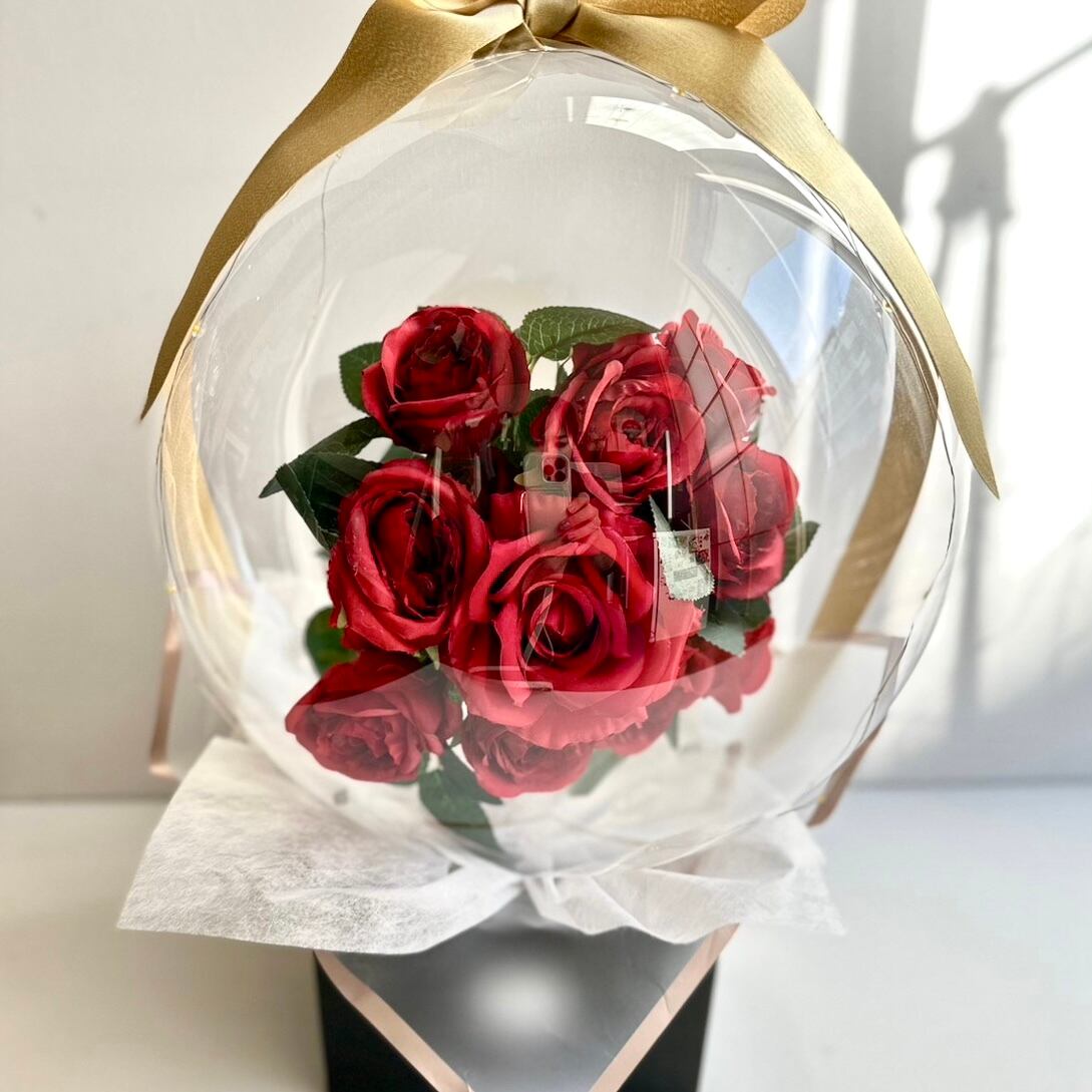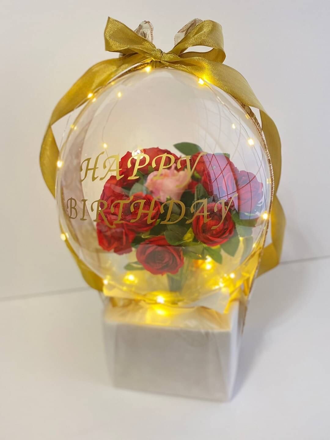 バルーンにボリュームたっぷりの薔薇を閉じ込めた置き型のアレンジです。